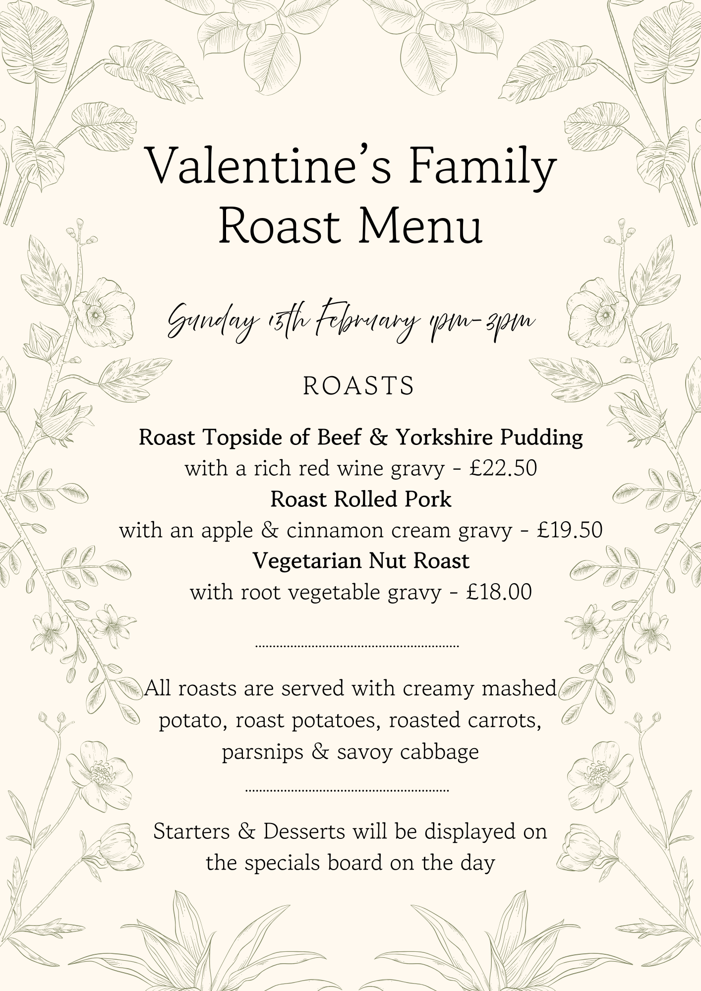 Valentine’s Family Roast available Sunday 15th February 1pm-3pm